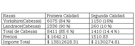 La tabla 3 resume la valoración económica del desempeño productivo de ambas razas en la categoría de cochinatas, se aprecia que de un total de 9821 cochinatas trabajadas, el 85.6 % (8411 animales categorizaron como primera calidad por tanto ingresaron a la UEB $ 13812628.31, el otro 14.4 % categorizó como de segunda y fueron las que ingresaron $ 2130274.81. Estos resultados pueden ser considerados como muy buenos y son reflejos del potencial genético para el crecimiento que muestran estas dos razas.