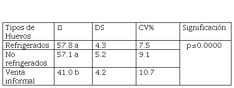 En la Tabla No. 3 se compara la calidad del huevo según el sistema comercial (diámetro del huevo). Se analizó la diferencia significativa entre los huevos vendidos en tiendas y vendidos en la calle, en relación con el diámetro del huevo. Se pudo percibir, que independientemente del tipo de conservación, los huevos refrigerados y no refrigerados (color marrón) presentan valores más altos en relación a los huevos de la calle (color blanco), donde nuevamente se enfoca en las diferencias en las razas, según Carvalho et al. (2015).
