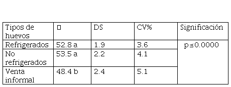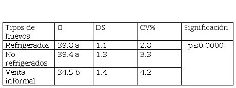 Se ha demostrado que los huevos refrigerados y los huevos de venta informal, no tienen diferencia en sus valores, lo que coincide con Lopes et al. (2012), quienes no encontraron diferencia en el peso de los huevos almacenados a temperatura ambiente y refrigerados por 35 días, y con Alleoni y Antunes (2001) los que afirman que la refrigeración mantiene la calidad interna de los huevos y prolonga la vida útil, y que el aumento del período de almacenamiento reduce la calidad interna de los huevos. Por lo tanto, se puede llegar a la conclusión de que los huevos de la calle estuvieron menos de 1 semana en el mercado y que la refrigeración de los huevos conservó su calidad interna.