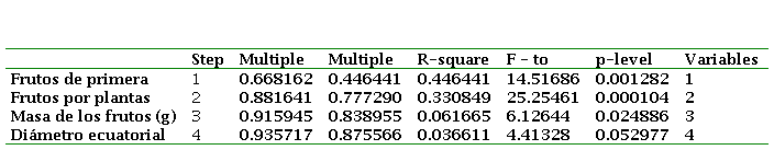 El coeficiente de variabilidad para la variable frutos de primera es de 0.44, lo que significa que el 44,64% de la variabilidad total del rendimiento del tomate depende de la calidad externa de los frutos, que el 33,08% de los cambios en el rendimiento obedecen a el promedio de frutos por plantas, que el 6,16% de los cambios en el peso de los frutos influyeron en el rendimiento en esta investigación y que el 16,10% de variabilidad no puede ser explicado por el modelo de regresión. Las causas pudieran deberse a otros factores o al azar (Ver Tabla 3).