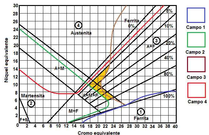 Se ha comprobado que la presencia de una pequeña cantidad de ferrita (d), capaz de precipitar alrededor del grano austenita, se evita la presencia de silicatos, es decir, que con una estructura compuesta por austenita + ferrita (dúplex), se elimina la tendencia al agrietamiento [3]. Con 2-5 % de ferrita es suficiente para evitar el agrietamiento, por lo tanto el metal de aporte debe garantizar un metal depositado con estas características, para esto es necesario el empleo del diagrama de Shaeffler; el cual relaciona la estructura del acero con su composición química total, teniendo en cuenta la influencia del resto de los elementos aleantes, agrupando y cuantificando los mismos en dos grandes grupos: los que favorecen la formación de la fase ferrítica (alfágenos) y los que favorecen la formación de la fase austenítica (gammágenos). Estos resultados de cuantificar la influencia en estos dos grupos se refieren a los elementos que mayor influencia tiene en la formación de estas fases, que son el cromo equivalente [Cr] y el níquel equivalente [Ni]. Las fórmulas del cromo y níquel equivalente son [4]: