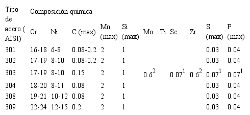 En la tabla No 1 se muestra la composición química de algunos de los aceros inoxidables austeníticos aleados al cromo níquel.
