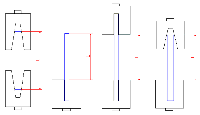 Altura mínima de la sección transversal: 1 mm. Aunque es menor que el ancho de las ranuras para fijar las probetas, en el caso que se ensayen muestras con valores menores que 10 mm y no queden bien sujetas se calzan las mismas en las zonas de apoyo para lograr la sujeción.