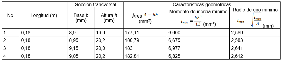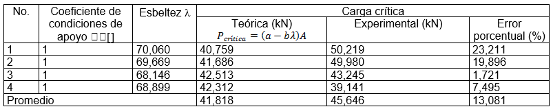 [1]Los resultados muestran diferencias entre el valor de la carga crítica obtenido por métodos experimentales y analíticos. El valor promedio de la primera es algo mayor que la segunda, pero la diferencia no es considerable siendo el error porcentual entre los valores promedios de solo el 13,081 %. Esto es atribuible a las características del material, al modo de aplicación de la carga y a la forma inicial de la barra antes de los experimentos. Se considera que la diferencia obtenida es permisible, incluso porque al ser mayor el valor experimental que el teórico se tiene una reserva de resistencia que está a favor del diseño.
