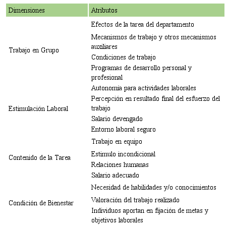 Para conocer las dimensiones y atributos que caracterizan la satisfacción laboral del cliente interno se aplicó un cuestionario a un grupo de trabajadores de los hoteles Pyme de la ciudad, siendo una muestra significativa para la aplicación del instrumento de medida, usando muestreo aleatorio estratificado, donde con la aplicación del paquete estadístico SPSS versión 22-2014 se seleccionaron aquellos atributos que superan el 80%, en lo anterior las matrices de datos se procesaron mediante un análisis de componentes principales.