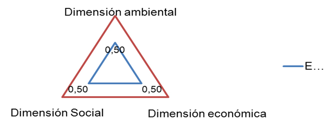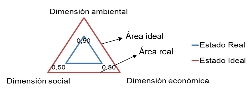 Paso 6: Evaluación integral de la sostenibilidad: El análisis de la evaluación integral se desarrolla a través del cociente resultante de la división entre el área conformada por la dimensión en su estado real y el área que podría conformarse si las dimensiones alcanzaran el máximo valor posible, es decir 3. Para mejor comprensión de lo explicado ver figura 2.