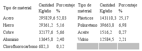 Paso 2. Caracterización de la composición del producto: Identificado el total de refrigeradores se procedió a caracterizar los mismos de acuerdo con las características más relevantes de estos a considerar en el proceso de reciclaje, valorando la composición del refrigerador por tipo de material ver tabla 2.