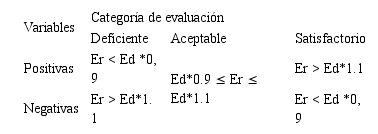 Se establecerán para la evaluación tres estados en función de la comparación entre el estado medido y el deseado, los niveles de evaluación se resumen en la tabla 5 en correspondencia del tipo de variable.