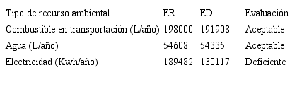 De acuerdo con la tabla anterior los consumos de recursos ambientales en todos los casos resultan superiores al deseado pero en el rango de lo aceptable el consumo de combustible y agua dado que el estado real no excede en más del 10% al estado deseado. El comportamiento del combustible en la transportación responde a que los recolectores independientes poseen medios de transporte con baja capacidad de carga y alto consumo de combustible. De igual forma en el caso del agua se logran alcanzar niveles aceptables de consumo dado que los mayores volúmenes de consumo se producen en la industria de reciclaje donde se recicla el agua aun cuando los niveles de consumo en el resto de los actores de la cadena son elevados. En lo relativo a la electricidad el propio proceso de reciclaje del agua en la industria y la tecnología deficiente de los otros actores, unido a la carencia de medidas de control eléctrico como el control del factor de potencia y los bancos de capacitores, generan el comportamiento deficiente.