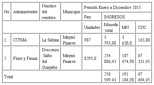 Datos ofrecidos por la agencia Ecotur y reflejados en la tesis de Maestría “Programa de gestión ambiental para el desarrollo del turismo sostenible en el sistema provincial de áreas protegidas, de Holguín”, refleja los ingresos por el desarrollo de esta actividad en el área de estudio, donde en el 2015 obtuvieron los siguientes resultados: