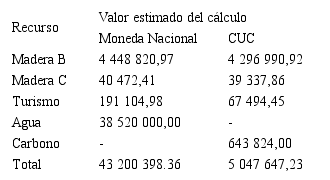 Se identifica el Valor Económico Total de los bienes y servicios ecosistémicos del área seleccionada con un valor de $ 43 200 398.36 pesos en moneda nacional y $ 5 047 647,23 en CUC (Datos conservadores), siendo el agua y la madera los recursos de mayor valor.