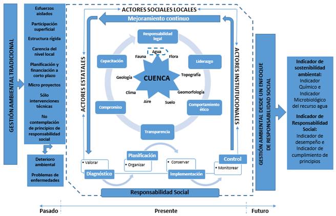 El modelo propuesto se basa en la responsabilidad social con fines de gestión como alternativa de sostenibilidad ambiental, esto como vía para contribuir a la conservación los recursos naturales de las cuencas, en especial el recurso agua por su importancia en el ciclo de vida.
