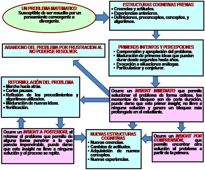 Es de resaltar que en la gran mayoría de los problemas resueltos dentro del salón de clases los bloqueos son de corta duración y en los primeros intentos por resolverlos emergen y se desarrollan las ideas que se constituyen en la solución de los mismos. Sin embargo, se conocen situaciones de estudiantes que han experimentado este tipo de insight, con una solución muy novedosa y una explicación fuera de lo común que, muy bien puede asociarse a un pensamiento divergente.