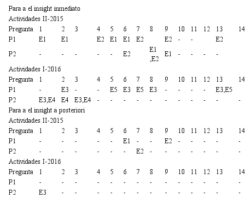 Se presentan la tabla 1 resumen las dos experiencias de las actividades con los diferentes problemas que permitieron dar la caracterización de los insight las que