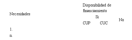 1. A continuación, se relacionan un conjunto de necesidades (problemas) del territorio vinculadas a la innovación. Para cada una marque con una (X) la posibilidad o no de financiar proyectos de innovación para su solución. En caso de que pueda contribuir al financiamiento marque en qué tipo de moneda (CUP o CUC), en caso de que disponga de las dos monedas marca en ambas casillas.