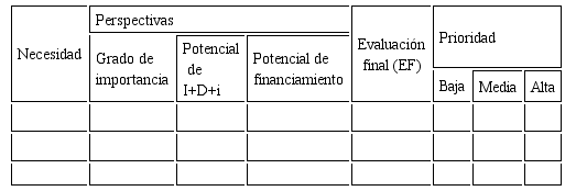 La matriz de jerarquización de las necesidades representada en la tabla 2.1 se confecciona a través de sesiones de trabajo grupal, a partir de la información gestionada en la etapa 2 y por consenso entre los expertos se otorgará la puntuación en una escala ascendente de valores de 1 a 10 a cada una de las perspectivas para cada necesidad relacionada.