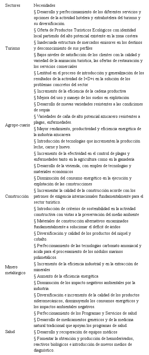 Como resultado del procesamiento de las encuestas se identificaron 139 necesidades en los 5 sectores encuestados. Luego de depuradas e integradas se obtuvo una relación de 67 necesidades, una representación de las cuales se ilustra en la tabla 2.