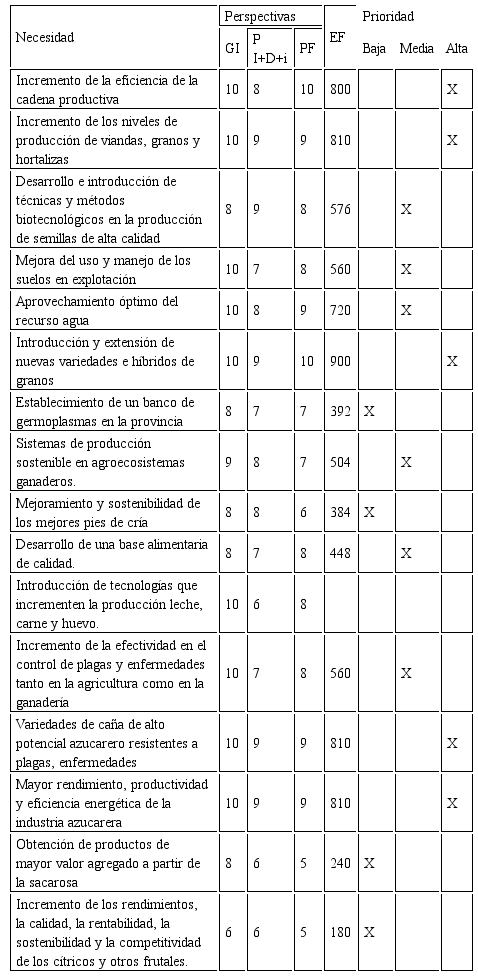 Como resultado se obtuvieron 32 necesidades con una PF ≥ 750, las cuales fueron seleccionadas de prioridad alta, se incluyeron en la Estrategia Provincial de Ciencia, Tecnología e Innovación 2017–2020 y constituyen la prioridad para contribuir a su satisfacción a través de proyectos y servicios de ciencia, tecnología e innovación.