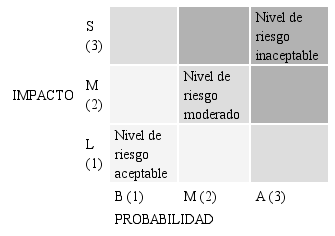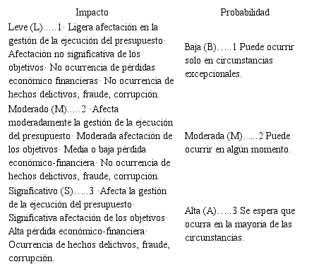 Una vez clasificados los riesgos, se valoran las principales vulnerabilidades, es decir, aplicar el principio de importancia relativa, combinando la estimación del impacto y la probabilidad de ocurrencia, en correspondencia con los criterios expresados en la tabla 1 y la figura 1 (matriz de riesgos); en los casos que sea posible se cuantifica (valoración estimada) la afectación o pérdida de cualquier índole que anualmente pudiera ocasionarse, matemáticamente expresado como , donde PE es la pérdida estimada o exposición expresada en pesos, F es la frecuencia, veces probables en que el riesgo se concrete en el año y V es la pérdida estimada en pesos para cada caso en que el riesgo se concrete.