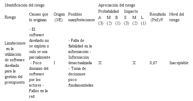 Como aporte práctico se ofrece una herramienta de fácil comprensión y aplicación para identificar, evaluar y controlar los riesgos vinculados a la gestión de la ejecución del presupuesto.