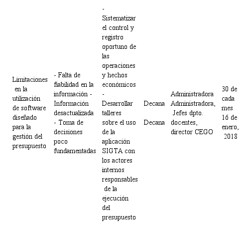 A pesar de los positivos pasos de avance que se han dado al respecto, aún persisten deficiencias, fundamentalmente en las facultades, lo que, unido a los cambios en el entorno y de la legislación vigente, tales como el proceso de integración universitaria entre otros, confirman la necesidad de perfeccionar la gestión de la ejecución del presupuesto. En entrevistas exploratorias realizadas a directivos y funcionarios administrativos, así como a partir de estudios preliminares realizados y análisis documental, se comprobó, entre otros síntomas, que aún es incipiente el análisis de los riesgos asociados a la gestión de la ejecución del presupuesto y acciones para su control.
