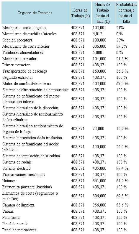 De los resultados obtenidos en la tabla 2 se puede observar que la probabilidad de trabajo sin fallo para una zafra de 408,371 horas, para los diferentes órganos de trabajo es de 52,5 % aproximadamente. Los peores índices de funcionabilidad los tienen: el mecanismo de cuchillas laterales y los tambores alimentadores.
