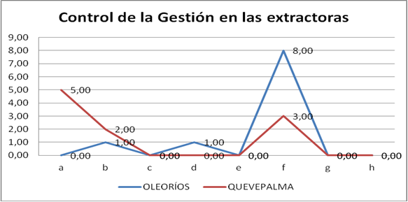 a) Contribuye a medir y corregir la labor ejecutada por los empleados, a fin de lograr los propósitos; b) Posibilita el análisis de lo realizado con lo planificado; c) Las técnicas y los sistemas de control son aplicables a cualquier actividad administrativa; d) Se constituye para los jefes en una herramienta, a través de la cual se comprueban si los propósitos de la organización son alcanzados de acuerdo a la planificación. En cuanto al control que se ejerce en las extractoras, existen tendencias distintas, los trabajadores de Oleorríos expresan que miden y corrigen los errores en las labores ejecutadas afín de lograr los propósitos, mientras que los de Quevepalma manifiestan que el cumplimiento de las actividades es una herramienta a través de la cual se comprueban si los propósitos de la organización tributan a la planificación de la misma.