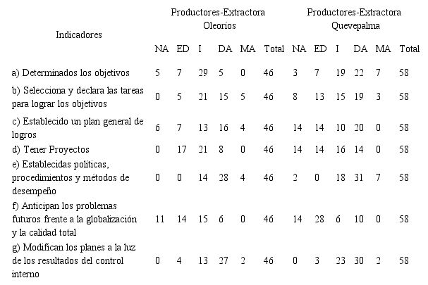 En tabla 1 se observa que existe una marcada indiferencia por parte de los productores que entregan la fruta en Oleorríos (29), sin embargo están de acuerdo con que la empresa tenga establecidas políticas, procedimientos y métodos de desempeño y que modifiquen los planes a la luz de los resultados del control interno (28); mientras que los productores de Quevepalma expresan que están en desacuerdo de que la empresa no se anticipe a los problemas futuros de globalización y de calidad total (28). Se ven indiferente frente a que la extractora modifique los planes a la luz de los resultados del control interno (23) y están muy de acuerdo con que la empresa tenga determinados los objetivos; seleccione y declare las tareas para lograr los objetivos; establecido un plan general de logros; establecidas políticas, procedimientos y métodos de desempeño (31); y que modifiquen los planes a la luz de los resultados del control interno (30).