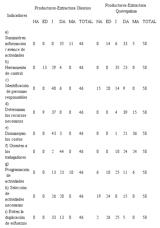 En la tabla 2 los productores de OLEORÍOS en su mayoría de indicadores manifiestan que les son indiferentes que les disminuyas los costos (43) o la identificación de personas responsables (40); sin embargo están de acuerdo con que la empresa suministre información y avance de actividades (35); orienten a los trabajadores (44) y programen actividades (23); mientras que los productores de QUEVEPALMA están en desacuerdo en que la empresa no cuenta con programas de selección de actividades necesarias (24) y de programas que eviten la duplicación de esfuerzos (26). Les son indiferentes las herramientas de control (35) y la programación de actividades de la empresa (25). Sin embargo, están de acuerdo con que suministren información y avance de actividades (33); Determinen los recursos necesarios y programen las actividades (39). Están muy de acuerdo que los programas que planifique aplicar la extractora disminuyan los costos (36)