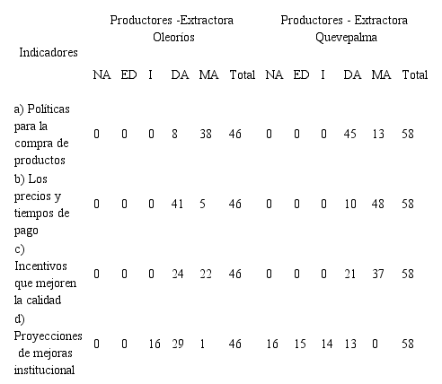 Se observa en la tabla 3 que los productores de Oleorríos están de acuerdo con que den a conocer los precios y tiempos de pago (41); y las proyecciones de mejoras institucional (29); y muy de acuerdo con que la empresa de a conocer las políticas para la compra de productos (38), similares a los productores de Quevepalma los cuales están de acuerdo con que la extractora dé a conocer las políticas para la compra de productos (45) y están muy de acuerdo con que la empresa de a conocer los precios y tiempos de pago (48).