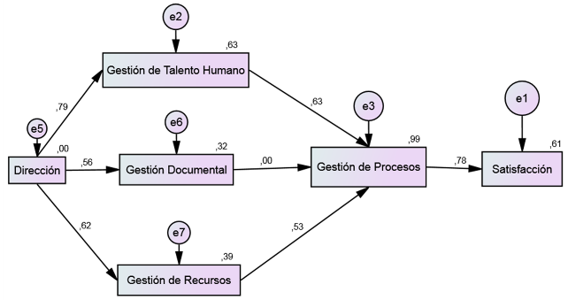 Las resultados estimaciones estandarizadas computados se observan en figura 1 mostrando las relaciones de causalidad.