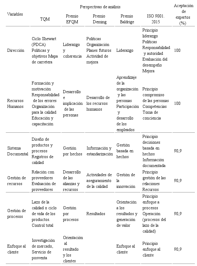 Selección de las variables que aseguran la calidad: Para la selección de las variables de calidad se debe partir de la revisión y clasificación de las variables abordadas en literatura de administración de la calidad y posteriormente ser sometidos a la valoración de un conjunto de expertos.