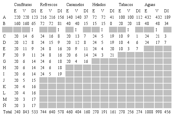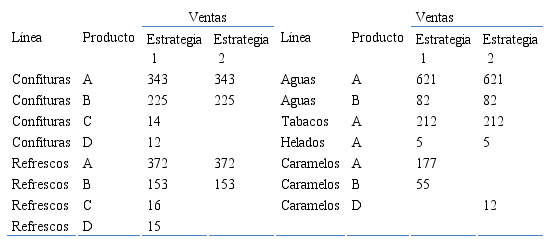 La organización objeto de análisis cuenta con 6 líneas de productos: Refrescos, Aguas, Confituras, Helados, Caramelos y Tabacos, cada una de las cuales posee diferente profundidad, la que oscila entre 4 y 14 productos, siendo la menos diversa las versiones de producto de agua para beber y la más variada las confituras. En la figura 1 se muestra el comportamiento de las ventas por líneas de productos en una semana de trabajo.