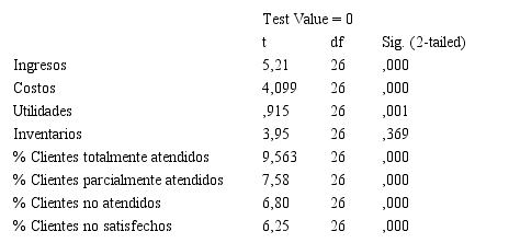 Para evaluar la consistencia y significación de los cambios estadísticos logrado en los indicadores, se realizó una prueba de hipótesis t de Studens a partir de establecer una frecuencia de medición semanal de los indicadores y dos periodos de comparación el primero contemplado por las mediciones antes de abril y el segundo por las posteriores a la fecha. Los resultados se muestran en la tabla 3.