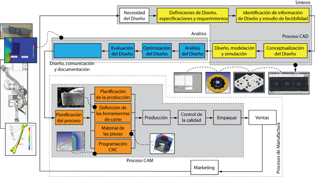 La Figura 1 muestra el ciclo de vida de un producto típico en el contexto de la Ingeniería. El desarrollo del producto comienza con la identificación de una necesidad industrial o una necesidad de la sociedad, basado en las demandas del mercado. Este proceso puede diferenciarse en dos grandes etapas, la etapa de diseño y la etapa de fabricación. Los procesos relacionados con el CAD son a la vez un subconjunto del proceso de diseño y los procesos CAM son un subconjunto del proceso de manufactura. Los sistemas CAE se utilizan tanto en un entorno de diseño como en un entorno de manufactura.