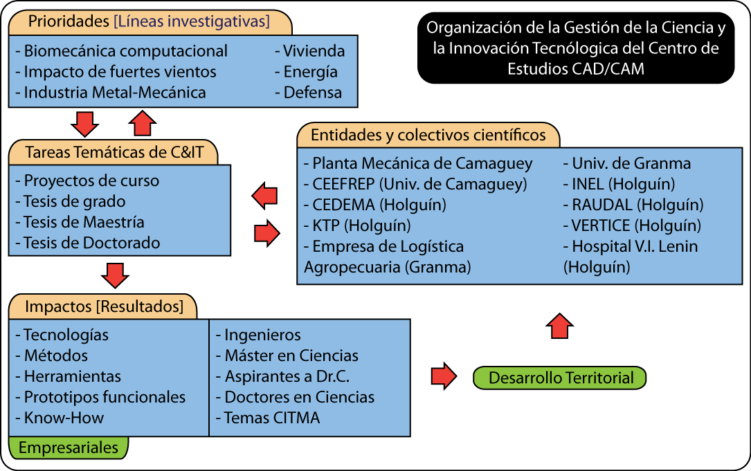 Resumen: En las últimas décadas, a escala mundial se aprecia una notable simbiosis de la investigación científica y la innovación tecnológica. Los diferentes marcos legales e institucionales se adecuan para garantizar el proceso de integración. Desde su creación, el Centro de Estudios CAD/CAM de la Universidad de Holguín ha utilizado un enfoque integrado de ciencia e innovación tecnológica, para propiciar el desarrollo de soluciones para los ámbitos empresarial y social. Se utilizaron los métodos histótico-lógico y de análisis-síntesis. El presente artículo tiene por objetivo mostrar los principales resultados que desde la gestión de la ciencia y la innovación tecnológica ha realizado el Centro de Estudios CAD/CAM en función del desarrollo económico y social del país en los últimos años.