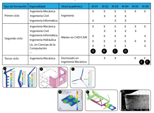 En la Figura 3 se muestran los componentes formativos vinculados al Centro de Estudios CAD/CAM relacionados con las AI (AI: Área de Investigación. AI-01: Biomecánica computacional; AI-02: Vivienda; AI-03: Energía; AI-04: Impacto de los fuertes vientos; AI-05: Defensa; AI-06: Industria Metal-Mecánica) que se desarrollan. Desde el punto de vista de formación de primer ciclo (formación de pre-grado), el Centro de Estudios se sustenta en una sólida Carrera de Ingeniería Mecánica en la Universidad de Holguín con más de 40 años de experiencia. En la actualidad, con una visión interdisciplinaria se incluyen a las Carreras de Ingeniería Mecánica, Ingeniería Civil e Ingeniería Informática (Figura 3). En su concepción de investigación, el CE dispone de Grupos Científicos Estudiantiles que son orientados hacia la investigación científica en las áreas de investigación.