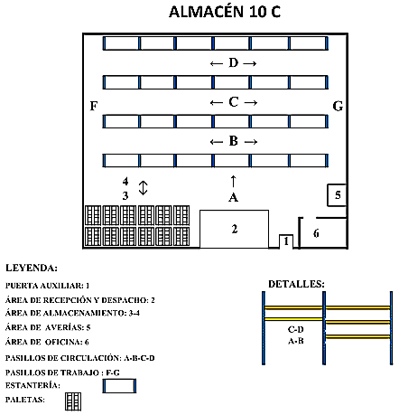 El Almacén Mayorista 10 C se caracteriza por ser un almacén no alimenticio, de dimensión grande y techado, además tiene 18.66 m de largo, 18 m de ancho, 6 m de altura, 5 m de puntal libre potencial, 336 m2 de área total, 67 m2 de área útil, 1680 m3 de volumen total y 301.5 m3 de volumen útil; cuenta con 1 montacargas, 1 Transpaleta manual, 1 ranfla móvil, 100 paletas de intercambio, 8 estanterías de viga metálica, un sistema de ventilación e iluminación natural como artificial, un estado constructivo bueno, un plan de fumigación contra plagas y vectores así como de limpieza. Los productos rotan atendiendo a la fecha de entrada al almacén, están ubicados en estanterías enumeradas por proveedor y controlados mediante tarjetas de estiba. Además, cuenta con una puerta de acceso, un extintor de polvo ABC a su entrada revisado periódicamente para la extinción de un principio de incendio, además la tecnología empleada según el nivel de mecanización semimecanizada y según el nivel de automatización semiautomatizada, y el flujo de las cargas no está definido. Con relación al proceso de almacenaje se evidencia que es el adecuado, ya que el encargado del almacén revisa los documentos del transportista, así como sello y número del contenedor; luego realiza la recepción a ciega de las mercancías que llegan al almacén, procediendo este al chequeo de la mercancía contra el documento de recepción elaborado. A su vez, se elabora el documento de reclamación en caso de faltantes o avería, se incorporan los productos en el submayor de inventario para darle entrada al mismo por parte del área contable, se revisan la correcta utilización de las marcas gráficas, se llenan la tarjeta de estiba para controlar las existencias según lo establecido en el almacén por parte del encargado y se conocen en cada momento los alojamientos vacíos para acceder a todos los surtidos, además se realizan las ordenes de despacho de acuerdo al producto de que se trate, revisan y controlan los despachos en cuanto a envase y embalaje, cantidad y calidad. Con respecto a la capacidad de almacenamiento se evidencia que no es la adecuada, ya que el almacén sólo aprovecha en área útil 19.94% y volumen útil 17.95% ambos por debajo de su patrón de comparación, sin embargo, en altura aprovecha un 90% lo que significa que es bueno. Por otra parte, se evidencia que la forma de almacenamiento es la correcta, ya que el grado de masividad por surtido se encuentra en el intervalo de 0.25 m3/s < M < 7 m3/s, dados por herramientas manuales, eléctricas y neumáticas con 19.15 m3 de demanda neta y 4.78 m3/s de grado de masividad; medios de protección, seguridad y salud del trabajo con 18.24 m3 de demanda neta y 4.56 m3/s de grado de masividad; sistemas eléctricos y de iluminación con 19.38 m3 de demanda neta y 4.84 m3/s de grado de masividad, y cerrajería con 13.13 m3 de demanda neta y 3.28 m3/s de grado de masividad, arrojando esta comparación que en todos los casos el método de almacenamiento es selectivo con acceso directo a las cargas unitarizadas y la técnica empleada es la utilización de estantería para cargas unitarizadas.