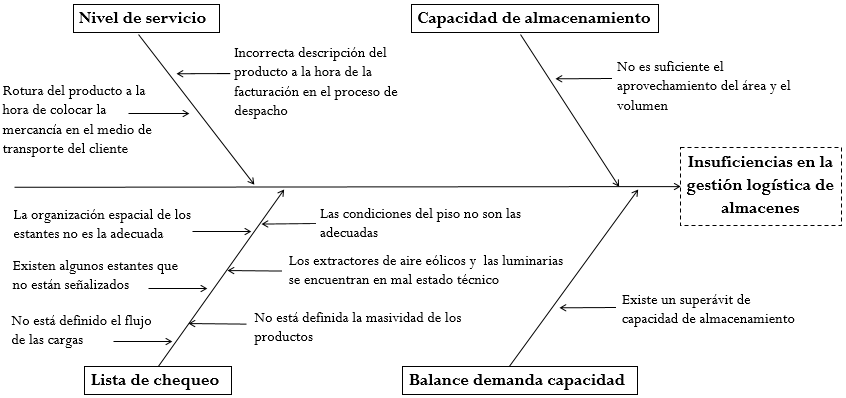 Una vez concluido el diagnóstico de la actividad de almacenaje se procede a la formulación del banco de problemas, estos problemas se representan de forma esquemática en el Diagrama de Ishikawa como se muestra en la figura 3. En este sentido, para seleccionar las causas de mayor influencia en el efecto arrojado por el diagrama, se realiza una encuesta a un total de 7 expertos seleccionados con la ayuda del software Decisión. A su vez, se valida la concordancia de los criterios emitidos por los expertos mediante el Coeficiente de Concordancia de Kendall, el mismo arroja que existe una concordancia de 0.98 entre los criterios emitidos la cual se considera confiable ya que se encuentra en el rango de 0 a 1. Concluyéndose a partir de los juicios emitidos por el grupo de experto (Eij), que las causas de mayor influencia en el efecto son: existe un superávit de capacidad de almacenamiento, incorrecta descripción del producto a la hora de la facturación en el proceso de despacho, existen algunos estantes que no están señalizados, las condiciones del piso no son las adecuadas, y los extractores de aire eólicos y las luminarias se encuentran en mal estado técnico.