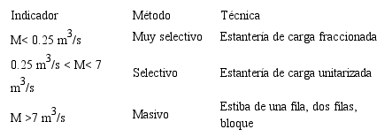 M: grado de masividad. Expresa la relación entre el volumen de productos almacenados y los surtidos que componen dicho volumen. Se expresa en m3/s