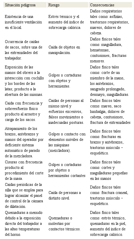 Resumen: Las personas y el desarrollo de su labor en ambientes seguros, constituye hoy un factor estratégico para el logro de resultados económicos, sociales y competitivos superiores. Sin embargo, los sistemas de Gestión de la Seguridad y Salud del Trabajo en muchas empresas y organizaciones no garantizan el objetivo para el que fueron creados, ya que no prestan la debida atención a los riesgos laborales e incluso en algunos casos, ni siquiera los investigan, debido a la ausencia de un procedimiento debidamente estructurado que se lo permita. En el artículo se resumen más de diez años de investigación que han aportado un procedimiento para identificar los riesgos que existen en las panaderías, lo que posibilita lograr un ambiente laboral adecuado para los trabajadores, disminuyendo el número de riesgos, accidentes y enfermedades profesionales, así como mejorar la salud e integridad física de los mismos y con ello su calidad de vida laboral.