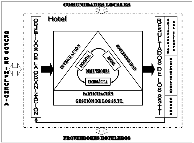 Éste, se sustenta en la integración de sus tres dimensiones esenciales: la ambiental, la tecnológica y la social, con un enfoque participativo y sostenible que garantizan resultados positivos en el cumplimiento de los objetivos: la satisfacción del cliente, la disponibilidad y los costos; es decir, el uso de la tecnología para la prestación de los servicios hoteleros, a la vez que se disminuyen los impactos ambientales solo se logra si se gestionan adecuadamente las relaciones, tanto internas como externas para satisfacer las necesidades de los clientes, lográndose alta disponibilidad de la infraestructura tecnológica, el confort y la imagen a costos razonables en un contexto dado.