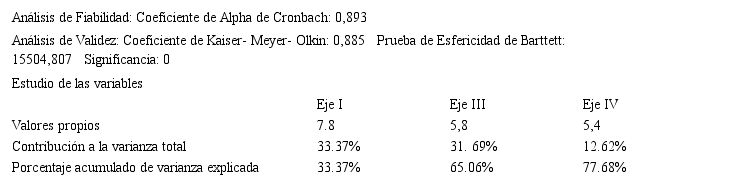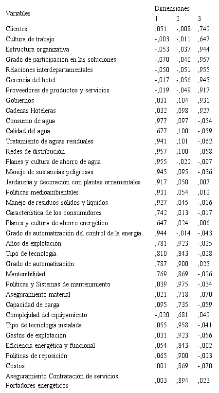 Posteriormente se requirió el ordenamiento de las variables obtenidas de acuerdo con el grado de importancia, concluyéndose las matrices de datos para su procesamiento mediante el paquete estadístico IBM SPSS Statistics (versión 21, 2015). Se empleó el análisis de componentes principales (Tabla 2 y 3), donde en los tres primeros componentes se logra explicar el 77,68 % de la varianza total, aspecto altamente positivo.