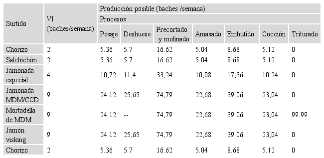La restricción física que se detecta en el proceso producción de embutidos en la UEB El CAITO es la insuficiente capacidad de producción ocasionada por la existencia de un punto limitante en la operación de amasado debido a la existencia de un único equipo de este tipo. Los resultados del cálculo de la capacidad de producción se muestran en la Tabla 1.
