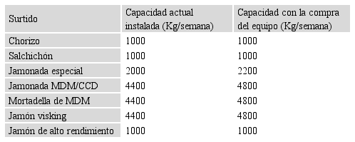 Esta situación acarrea que la producción sea limitada a baches de 200Kg, coincidiendo con la capacidad de este equipo, constatada por el cálculo de la capacidad del proceso, siendo el coeficiente de pérdidas de 0,12 para el chorizo, Salchichón, jamonada especial, jamonada MDM/CCD, jamón visking y jamón de alto rendimiento y 0,16 para la mortadela MDM.