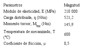 El momento torsional a que está sometida la herramienta de corte se determinó por la ecuación 11, de acuerdo con el material a mecanizar, la profundidad y el ancho de corte, el diámetro de la fresa, el avance lineal de la pieza, S = 60,48 mm/diente y la velocidad de corte, vc = 0,25 m/s, entonces Mtor = 145,9 N·m.