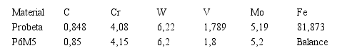 Como se observa en la tabla 2, el promedio de las mediciones de la composición química, del material analizado, está dentro del rango establecido para la aleación, la que se corresponde con el acero rápido P6M5, de acuerdo con las especificaciones de GOST 17 270.