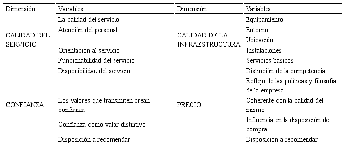La fiabilidad del instrumento fue analizada a través del coeficiente Alfa de Cronbach según el cual todas las variables y dimensiones eran fiables: Calidad del servicio (0,824), Calidad de la infraestructura (0,903), Confianza (0,753) y Precio (0,866) como se puede apreciar todos resultaron superiores a 0,75. En la tabla 2. Se resumen los resultados logrados por cada variable en cada segmento.