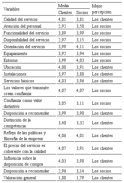 En la figura 1 se resume el comportamiento de la percepción de los clientes y socios sobre cada una de las dimensiones como se puede observar ambos públicos objetivos poseen similares percepciones en cuanto a las dimensiones calidad de la infraestructura, calidad del servicio y confianza y solamente difieren de manera notable en la percepción del precio donde como es normal los socios lo perciben como justo mientras los clientes lo perciben como deficitario esto puede obedecer a múltiples razones: los clientes desconocen el comportamiento de los costos que justifican los precios, los precios están establecido a partir de un rango excesivo de deseo de generación de utilidades o los clientes perciben la aplicación del instrumento como una oportunidad para gestionar la siempre beneficiosa reducción de precios para este público objetivo.