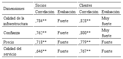 Además de los análisis anteriores se realizó un análisis de correlación a través del coeficiente de correlación de Pearson para determinar el grado de correlación existente entre cada una de las dimensiones evaluadas a través de la determinación de las medias de las variables que la integran y la variable satisfacción general con el servicio. Estos resultados se reflejan en la tabla 3 como se puede observar en todos los casos para ambos públicos objetivos los niveles de correlación son considerados muy significativos, aunque se registran como valor más bajo de correlación el de la calidad del servicio con 0,646 en los socios, lo que puede ser interpretado como una evidencia de que existe una imagen sobrevalorada por parte de los socios del servicio y de la forma en que están influyendo en los clientes. La otra variable que muestra oportunidades de mejora es el precio en lo fundamental por las razones anteriormente expuestas. También, es conveniente señalar que en las cuatro dimensiones los niveles de correlación de los socios resultan valoradas como fuerte mientras que en la de los clientes solo las dos dimensiones con mayor dificultad lo son.
